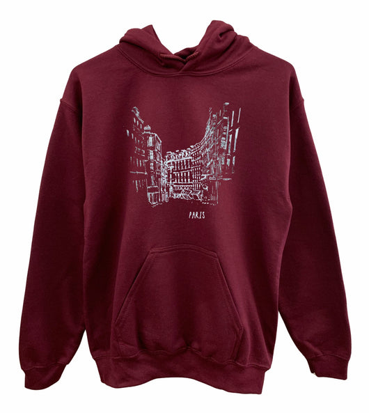 A hand drawn street in Paris graphic design on a soft, 50% cotton/50% polyester hooded sweatshirt with a front pocket and drawstrings for the hood. This item was screen printed for long lasting durability.